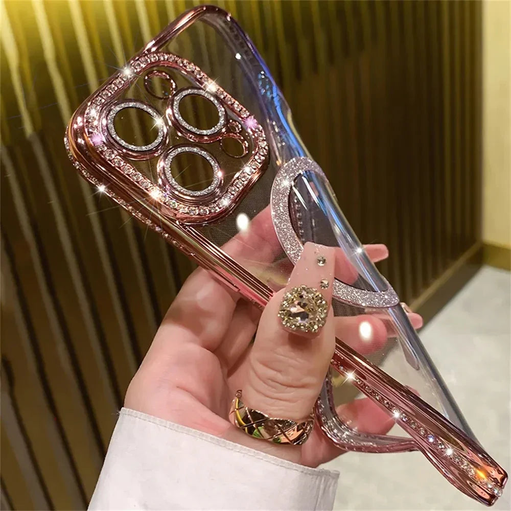 2024 New Fashion Glitter Diamond Transparent Case For iPhone 15 16 14 Plus 13 12 11 Pro Max Magnetic Wireless Charge Bumper Cover